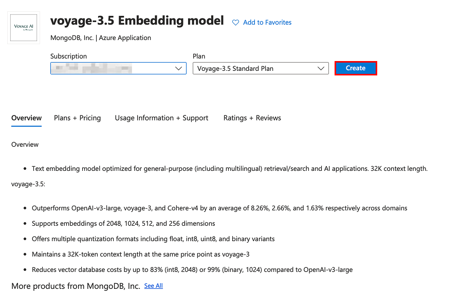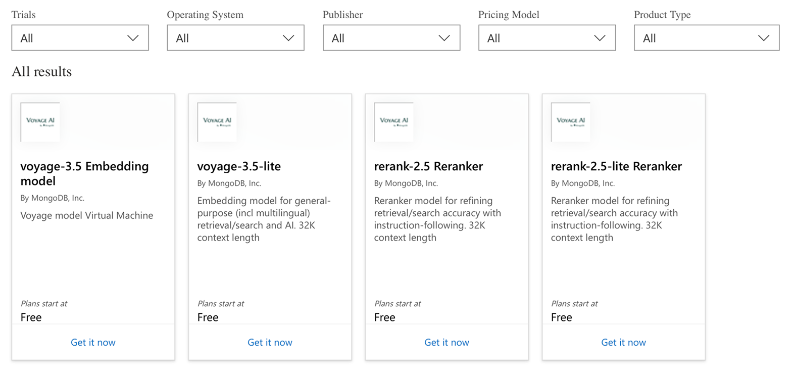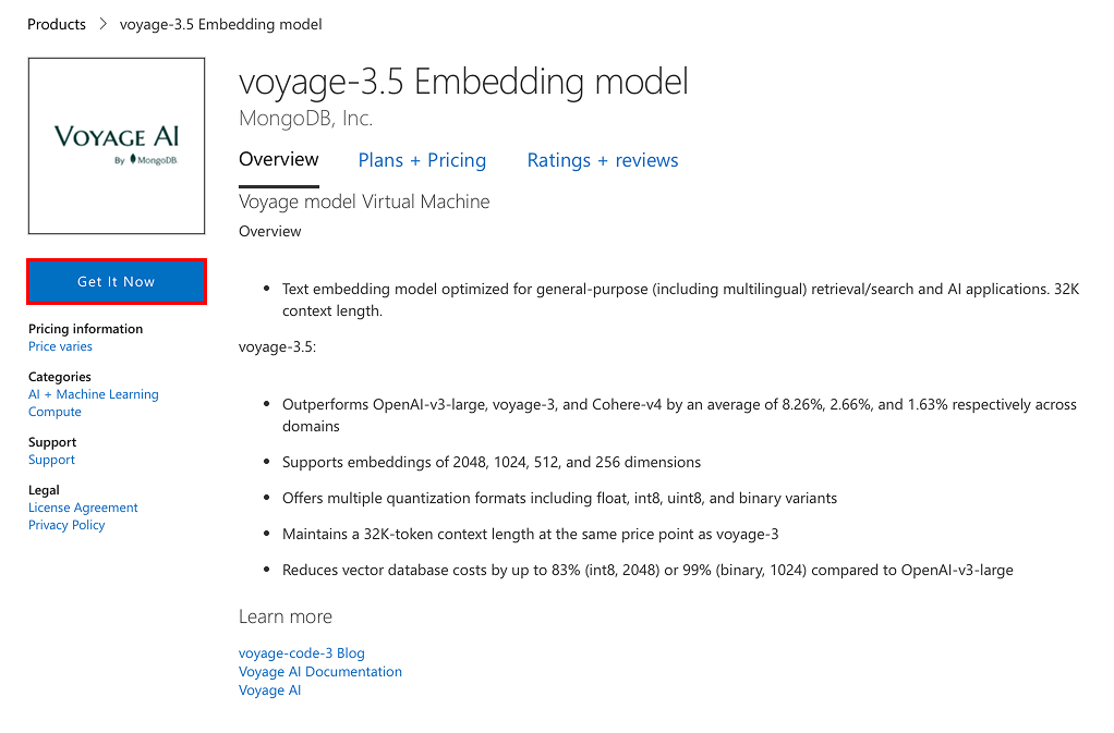You can deploy the following MongoDB Voyage AI models and rerankers on Azure Marketplace: