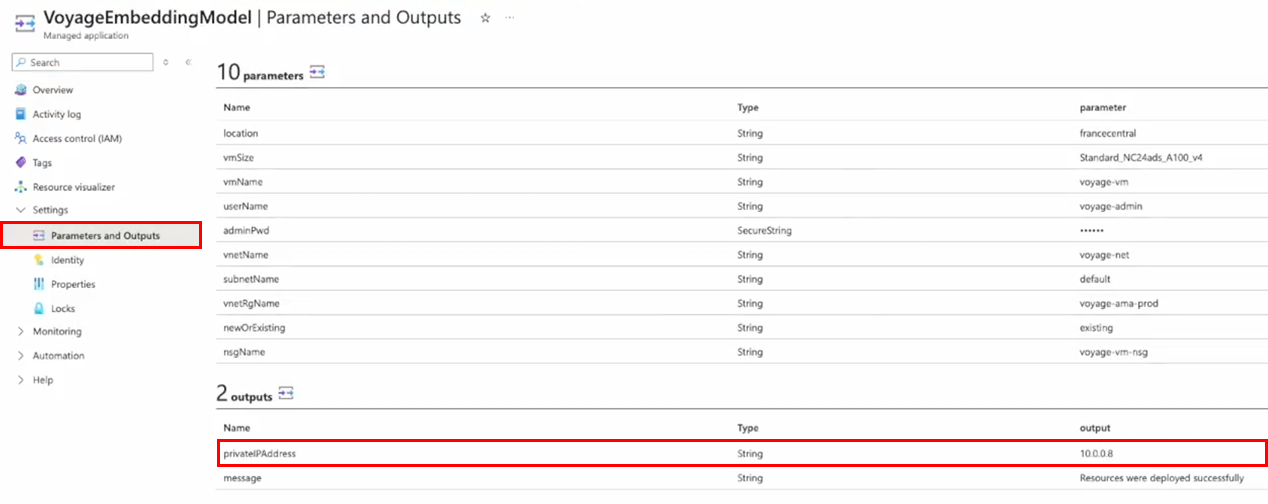 - IMPORTANT: From the application resource page, get the private IP of the endpoint by clicking on Parameters and Outputs under the Settings section. Take note of the private IP (”privateIPAddress” output); you will need this IP address to invoke the application endpoints.